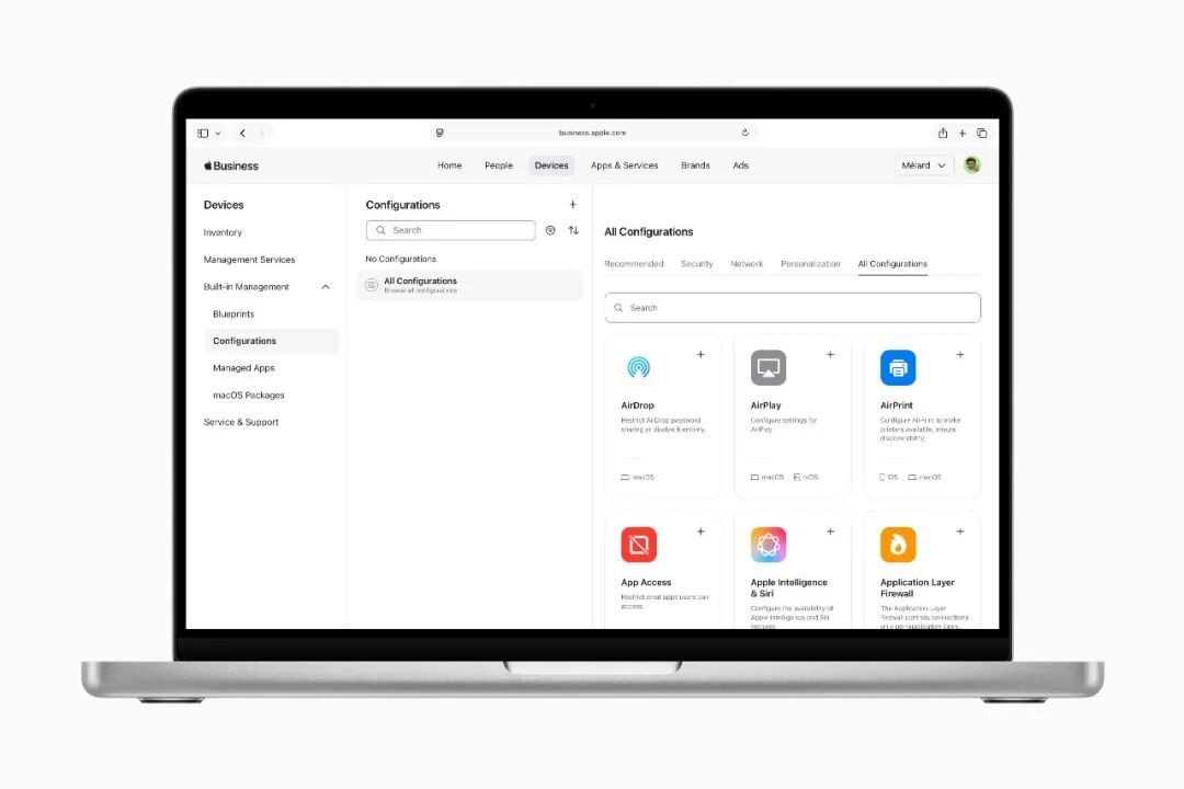 现在,管理员在Apple商务后台创建“预设集”。比如“销售组”预设:自动安装CRM App、强制开启锁屏密码、禁止安装非企业App。“财务组”预设:安装财务软件、禁用摄像头、开启两步验证。员工拿到新iPhone,开机后输入公司账号,所有配置自动下载,全程不需要 IT 人员碰设备。苹果管这叫“零接触部署”。