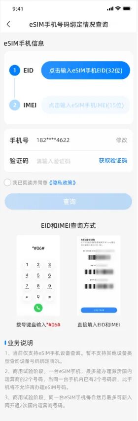 在查询页面,用户需要输入设备的 IMEI (终端串号) 和 EID (eSIM芯片序列号) 两项信息。