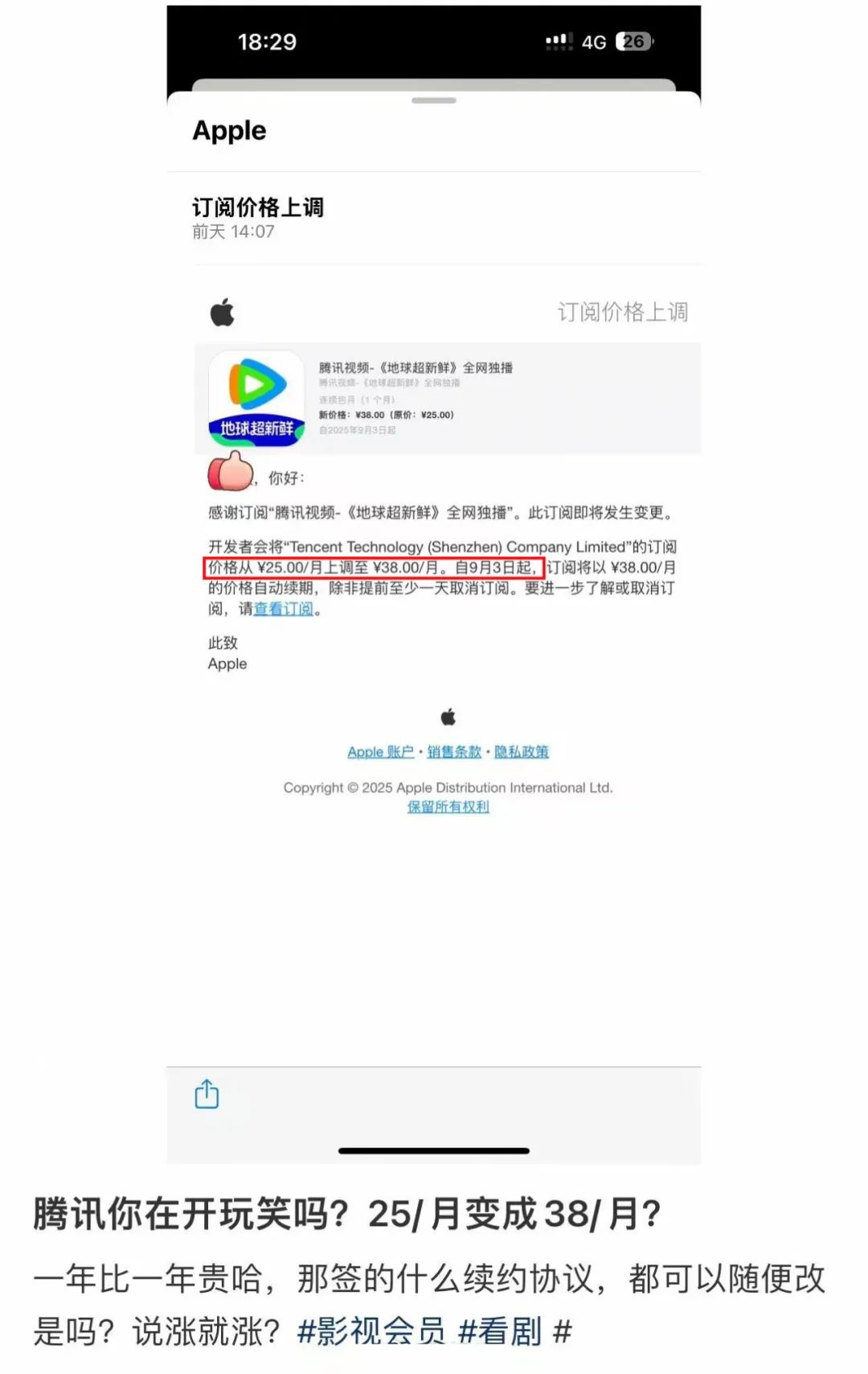 近日,有网友在社交平台发帖表示,收到苹果系统推送的通知,显示腾讯视频连续包月VIP订阅价格将从25元上调至38元,自2025年9月3日起生效。