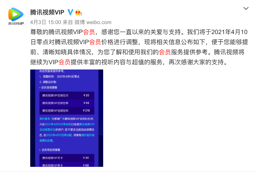 2021 年 4 月 1 日,腾讯视频首次宣布调价,VIP 连续包月价格从 15 元涨至 20 元,包季价格从 45 元涨至 58 元,包年价格从 178 元涨至 218 元。