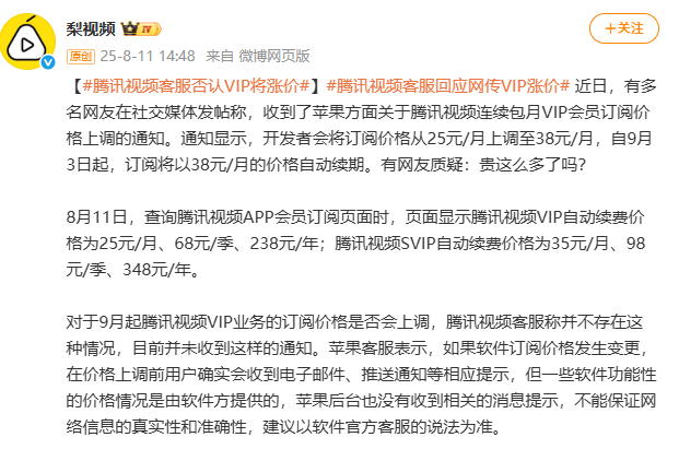 截至2025年8月11日,腾讯视频APP内显示的VIP自动续费价格仍为25元/月、68元/季、238元/年;SVIP自动续费价格为35元/月、98元/季、348元/年。