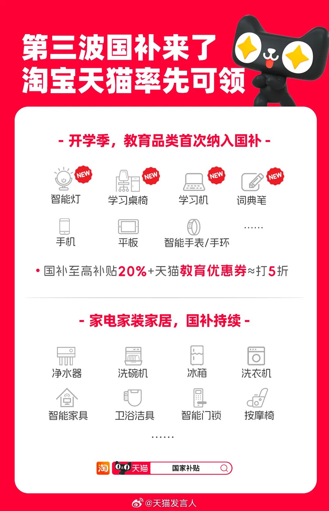 国家以旧换新第三批资金已下达,总额690亿元,自8月26日起国补正式恢复后继续限量领取,目前淘宝天猫率先开放领取通道。