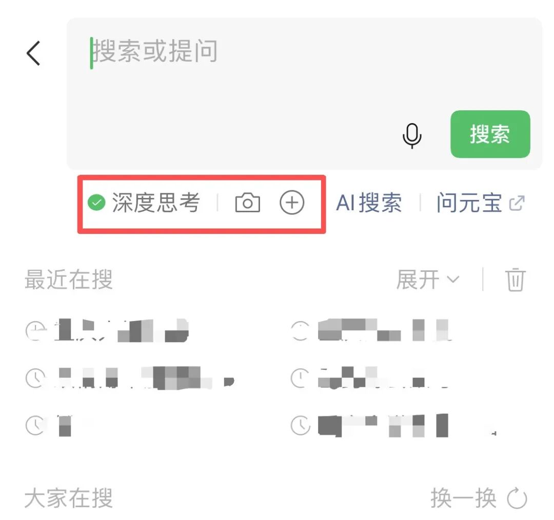 首先,微信搜索界面更新,已具备更强的 AI 搜索能力。微信搜索框下已接入深度搜索和多模态的能力,通过微信首页顶部点击搜索框就能看到。