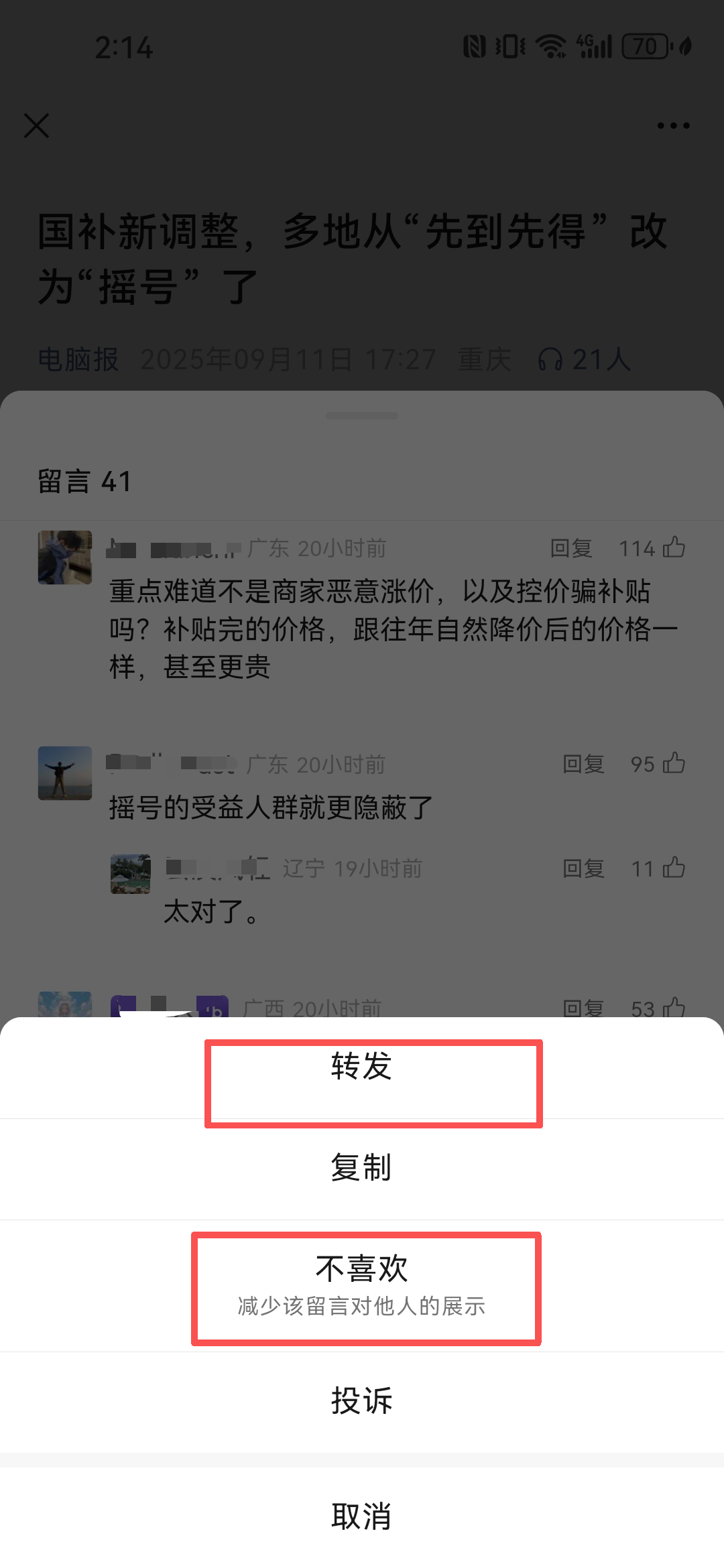 此外,评论区长按评论内容,在出现的菜单中新增了“转发”“不喜欢”等选项,前者可将评论以图片的形式转发好友、朋友圈或发布到公众号,后者可减少该留言对他人展示。