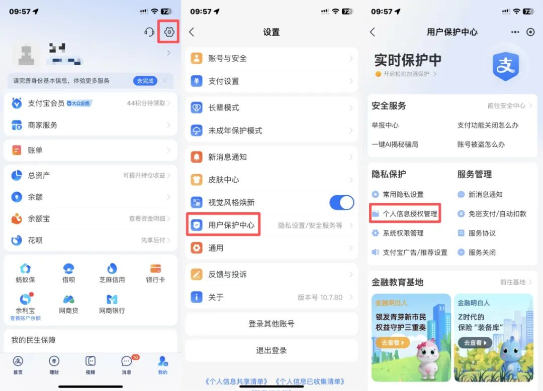 打开支付宝App → 点击“我的”→“设置”(右上角齿轮图标)→ “用户保护中心”→“个人信息授权管理”,选中对应的应用或小程序→ 解除授权。