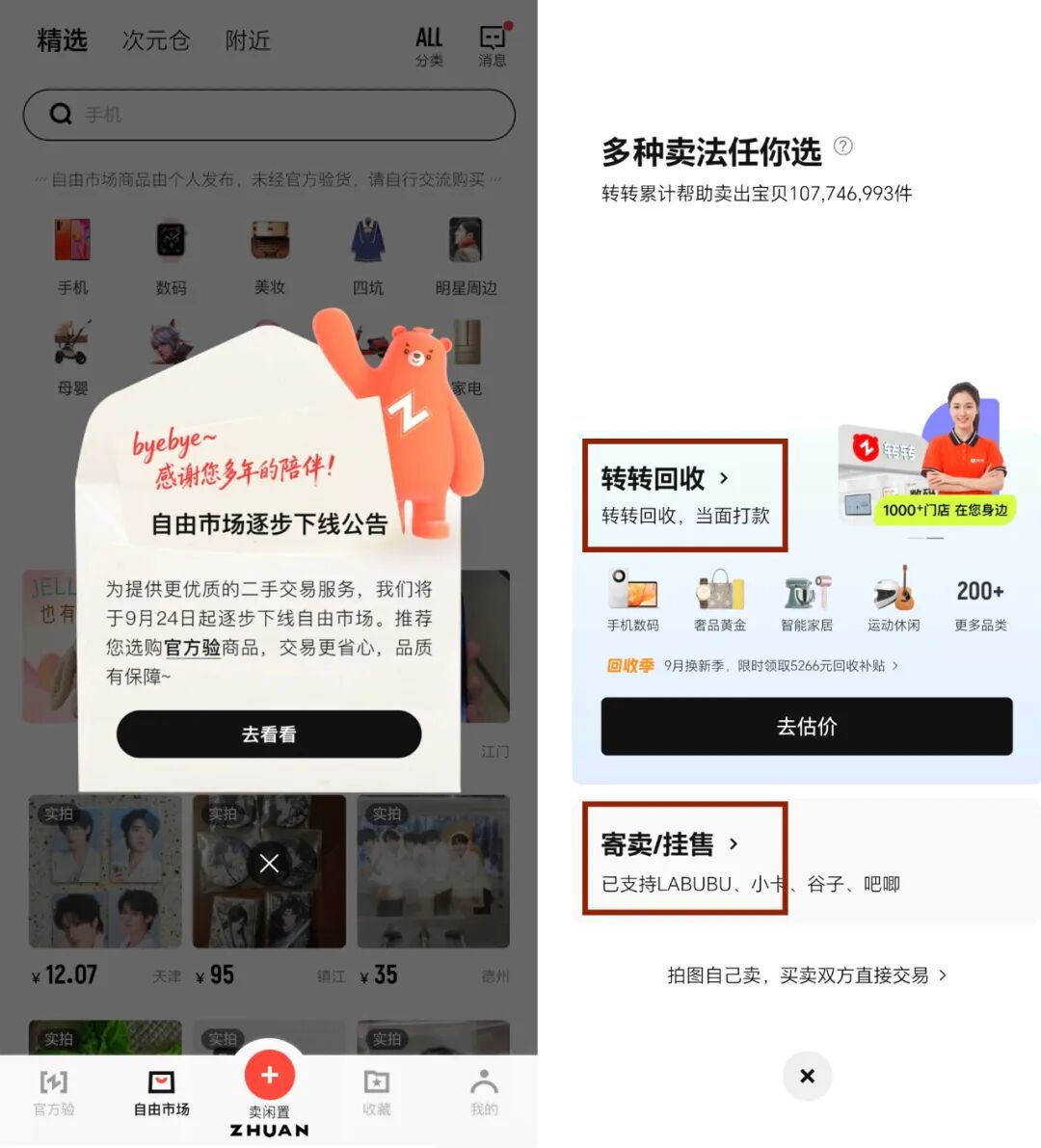 时间流程上,9月24日关闭个人商品发布入口,只保留回收和寄卖/挂售两个渠道;