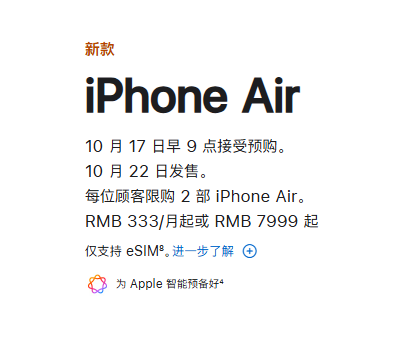 官网确认国行版 iPhone Air 非合约机。但仅国行版 iPhone Air 支持国内运营商 eSIM,海外版设备不可用