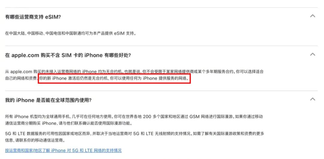 在“常见问题解答”栏目中,苹果方面写道:“从 apple.com 购买的未接入运营商网络的 iPhone 均为无合约机。也就是说,你不会受限于某家网络提供商或某个多年期服务合约。你可以选择适合自己的网络和资费,你的新 iPhone 激活后仍然是无合约机,你可以使用任何为 iPhone 提供服务的网络。”
