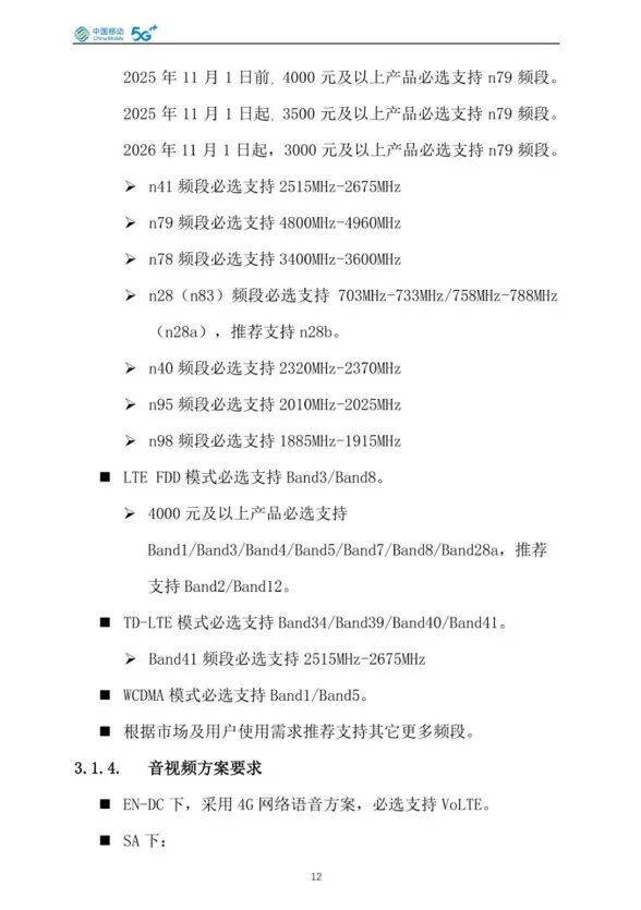 此外,新消息还表示,在 2025 年 11 月 1 日前,4000 元及以上产品必选支持 n79 频段。2025年11月1日起,3500元及以上产品必选支持n79频段。2026年11月1日起,3000元及以上产品必选支持n79频段。