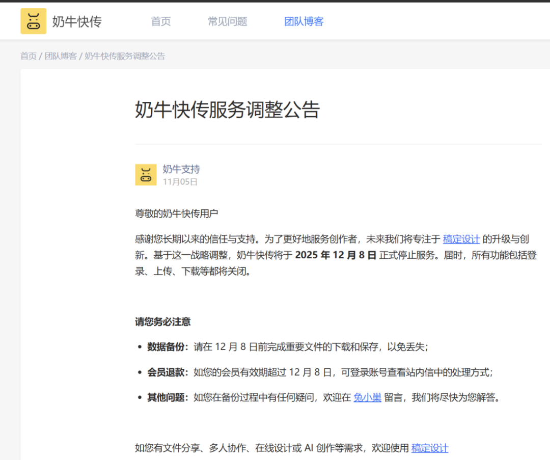 此前奶牛快传已经发布公告称,将于2025年12月8日停止服务,并决定将重心转移到新产品“稿定设计”上。