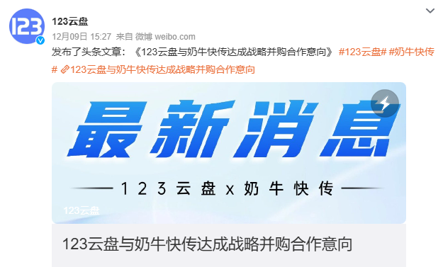 与此同时,123云盘也发文表示,123云盘已就战略并购奶牛快传相关事宜开展深入磋商,并已达成初步合作意向。待正式完成并购后,123云盘将进一步优化服务体系,持续提升服务能力,为广大用户提供更优质、更高效、更全面的云服务体验。