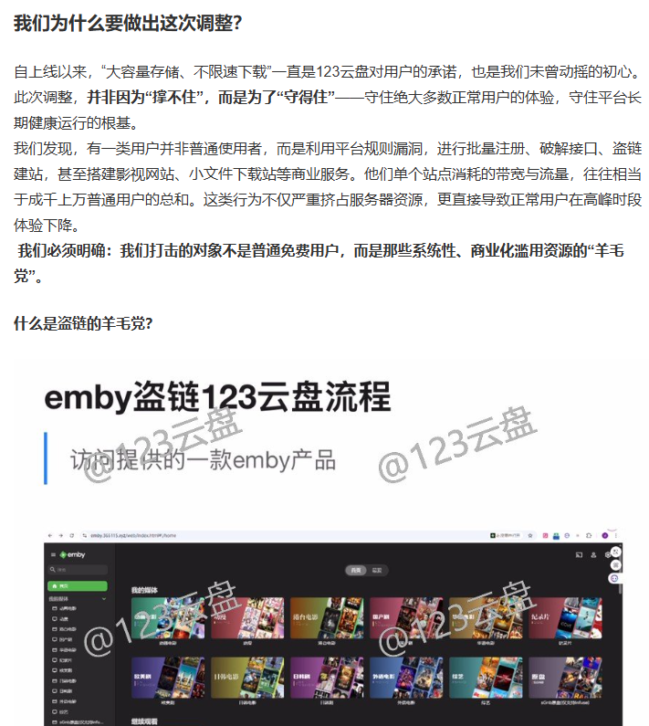 官方发现有大量“职业羊毛党”利用技术手段,把123云盘当免费CDN(内容分发网络)用,比如搭建影视站、小文件下载站,甚至通过破解接口批量占用资源。