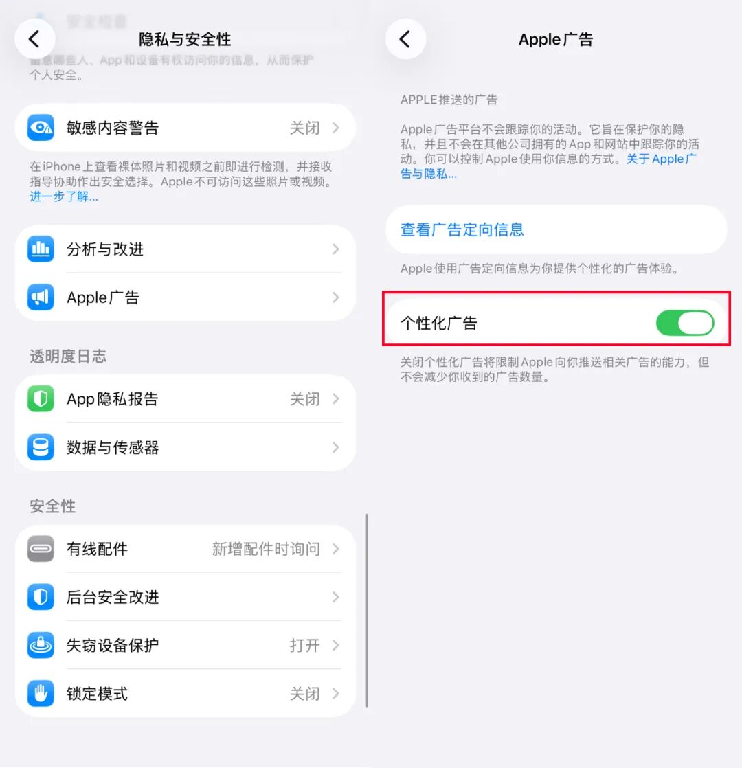 关闭后, 苹果将不再使用你的搜索历史、下载记录或关注内容来向你推送相关的广告。你看到的广告会变成随机的、与你无关的内容,视觉干扰会大幅降低。