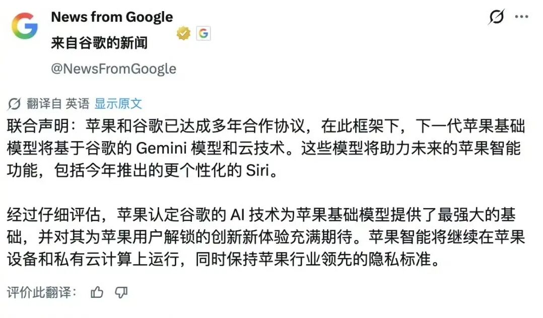 苹果和 Google 发布联合声明,称双方已达成合作协议,苹果决定常规性地接入谷歌 Gemini,将其作为苹果 AI 的“核心大脑”。