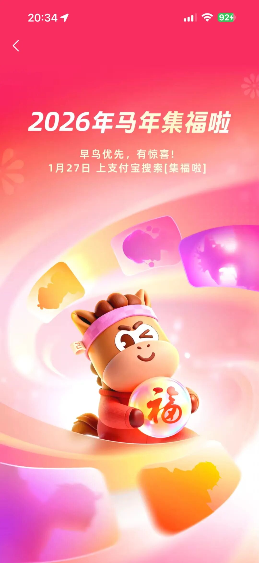 支付宝宣布,2026年1月27日将启动“马年集福”预热,用户可以进入支付宝应用搜索“集福啦”参与抢稀有卡。