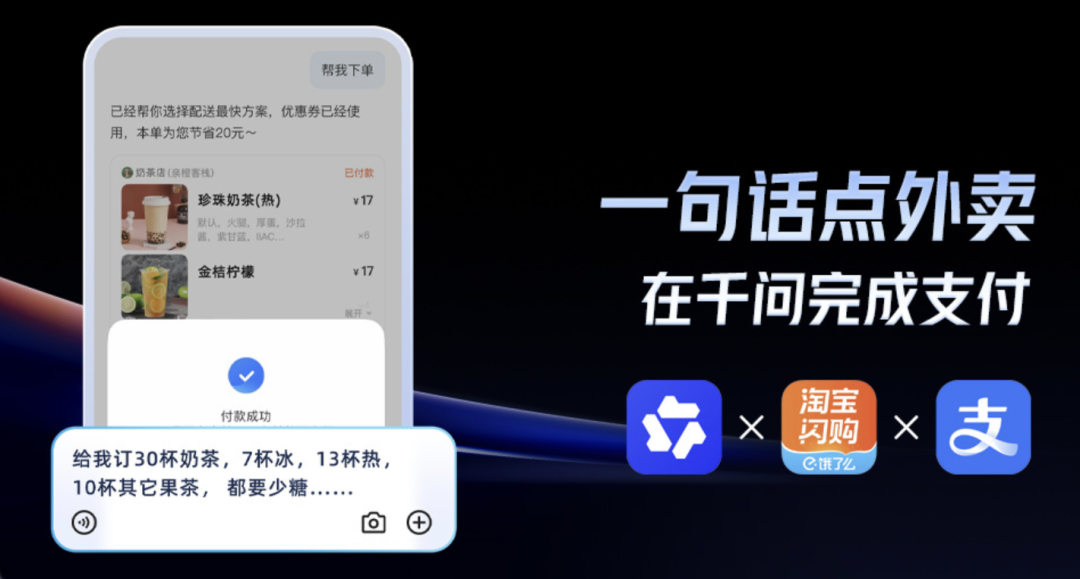 比如,用户只需在千问的聊天框里输入“帮我点杯XX家的XX奶茶”,千问会自动调用淘宝闪购的服务,定位你附近的门店,生成订单,并通过内置的“支付宝AI付”功能直接付款。