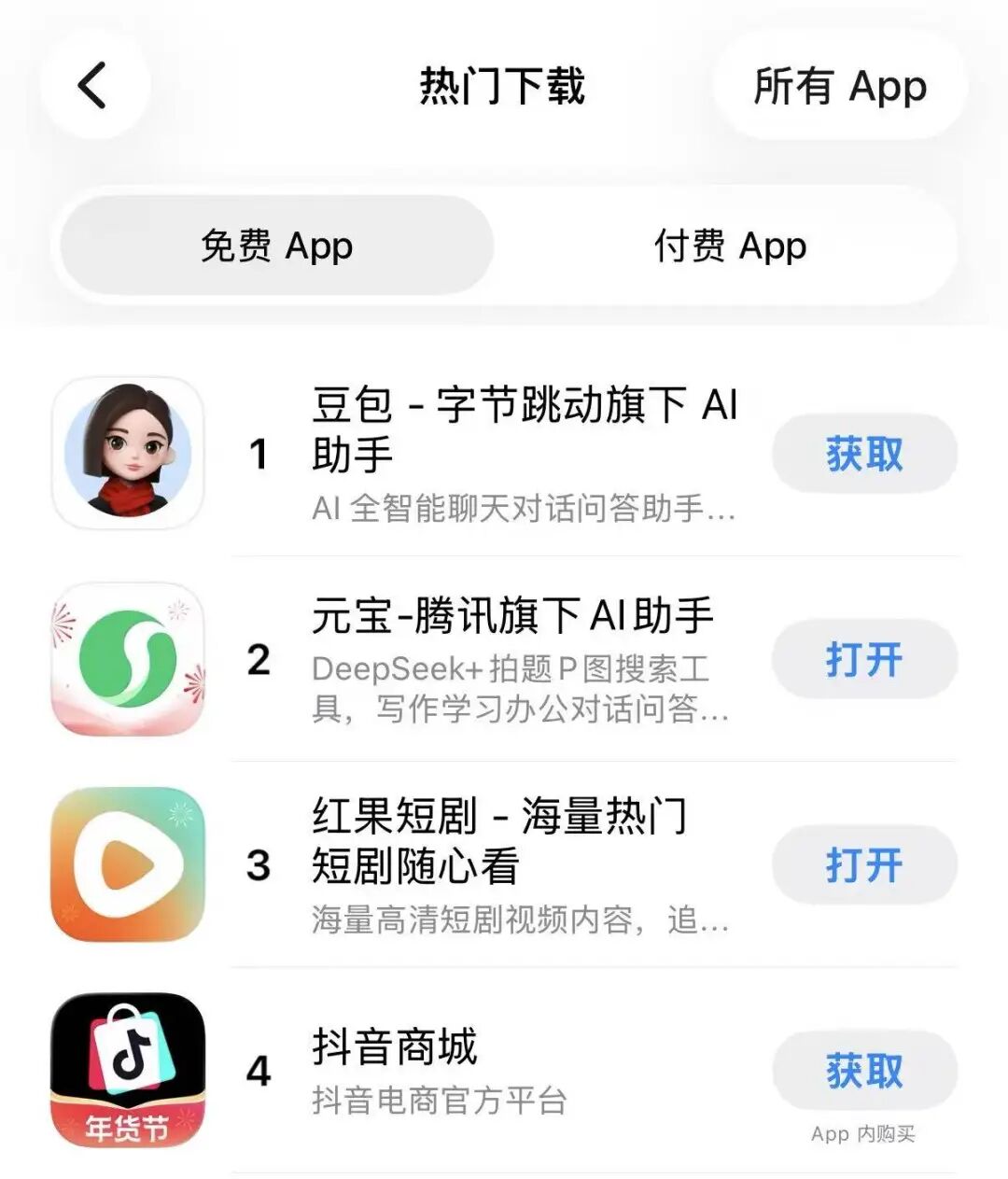 目前,在苹果的 App Store 中,腾讯元宝的下载量已经飙升到国内免费App排行榜第二的位置,仅次于字节的豆包。